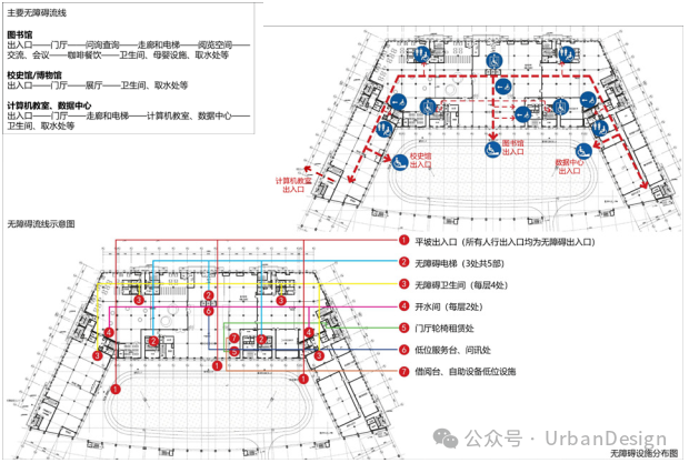 通過使用者視角的帶入,設(shè)計(jì)師在建筑內(nèi)部嘗試構(gòu)建連貫的無障礙流線(圖 9),連接各功能空間和無障礙設(shè)施,保證通行寬度和連續(xù)性,確保安全性和所有空間、設(shè)施可達(dá)易用。