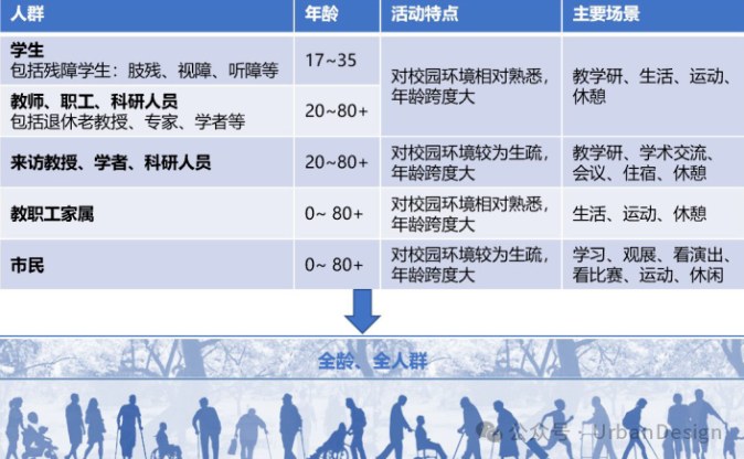 包容性校園的服務(wù)對(duì)象不再是少數(shù)殘障或運(yùn)動(dòng)損傷學(xué)生,而是擴(kuò)展到全體在校師生及工作人員,以及來往于校園的專家學(xué)者、研究人員及普通市民,即面向全體社會(huì)成員,年齡覆蓋全齡(圖 1)。因此,校園環(huán)境在解決殘障群體需求的基礎(chǔ)上,在空間規(guī)劃和設(shè)施供給中,需要考慮校園內(nèi)各類人群學(xué)習(xí)、工作、生活需求及不同的體能特征和認(rèn)知能力,提供多種可供選擇的通行、使用、交互和服務(wù)的方式。