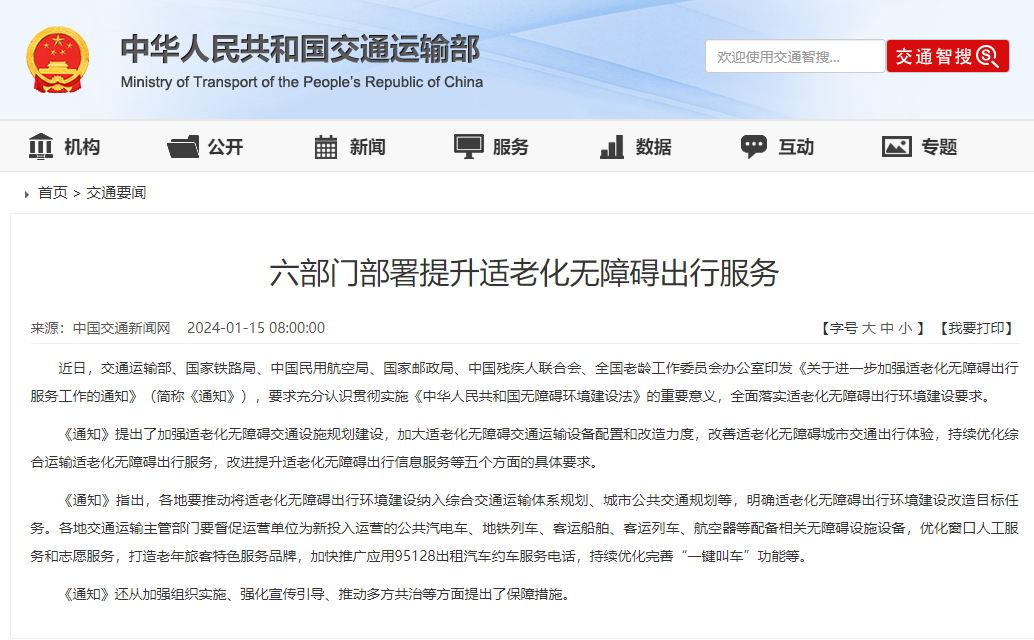 日前,交通運輸部會同國家鐵路局、中國民用航空局、國家郵政局、中國殘疾人聯(lián)合會、全國老齡工作委員會辦公室等6部門和單位印發(fā)了《關(guān)于進一步加強適老化無障礙出行服務工作的通知》(以下簡稱《通知》),就進一步加強適老化無障礙出行服務進行工作部署。