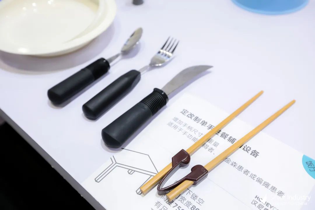 特制餐勺筷子:彎曲餐勺,只需轉(zhuǎn)動手腕就能輕松取食;電動防抖勺,在高速抖動下,勺中的食物依然可以保持不掉;加重易握餐具等……使老年人能夠靈活自主進食。