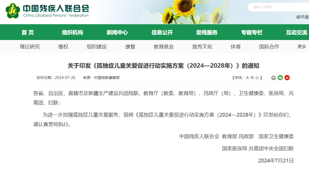 中國殘聯(lián),印發(fā)《孤獨癥兒童關(guān)愛促進行動實施方案(2024-2028年)》https://www.cdpf.org.cn/zwgk/zcwj/wjfb/e9e23982df5248e3b0d82d180c368996.htm