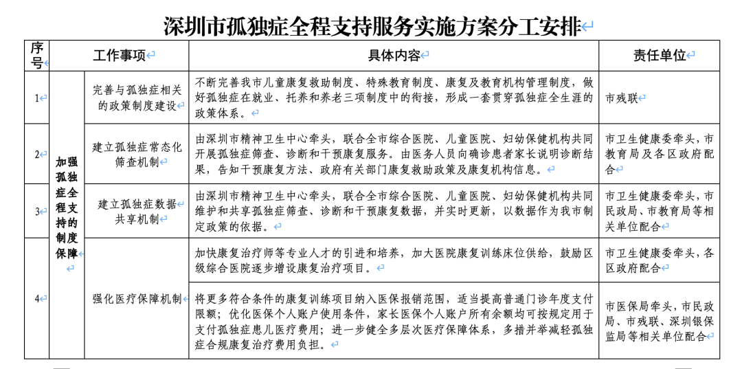 在此之前,深圳市已于2023年10月印發(fā)《深圳市孤獨癥全程支持服務(wù)實施方案》,提出六大方面31項工作任務(wù),希望實現(xiàn)的工作目標是: