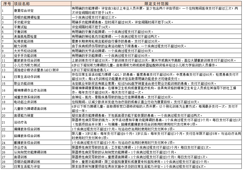 另外19個醫(yī)療康復項目放到了康復科,其中,運動療法、作業(yè)療法和平衡訓練的支付期限都提高到了180天。