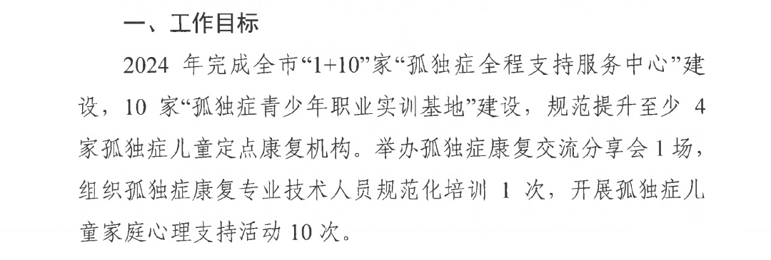 “持續(xù)提升孤獨癥早期篩查、診斷、康復水平,推進孤獨癥兒童融合教育,促進成年孤獨癥就業(yè),加強重癥孤獨癥托養(yǎng),做好孤獨癥民生兜底保障和無障礙環(huán)境建設(shè),建立完善我市孤獨癥全程支持服務(wù)體系。”