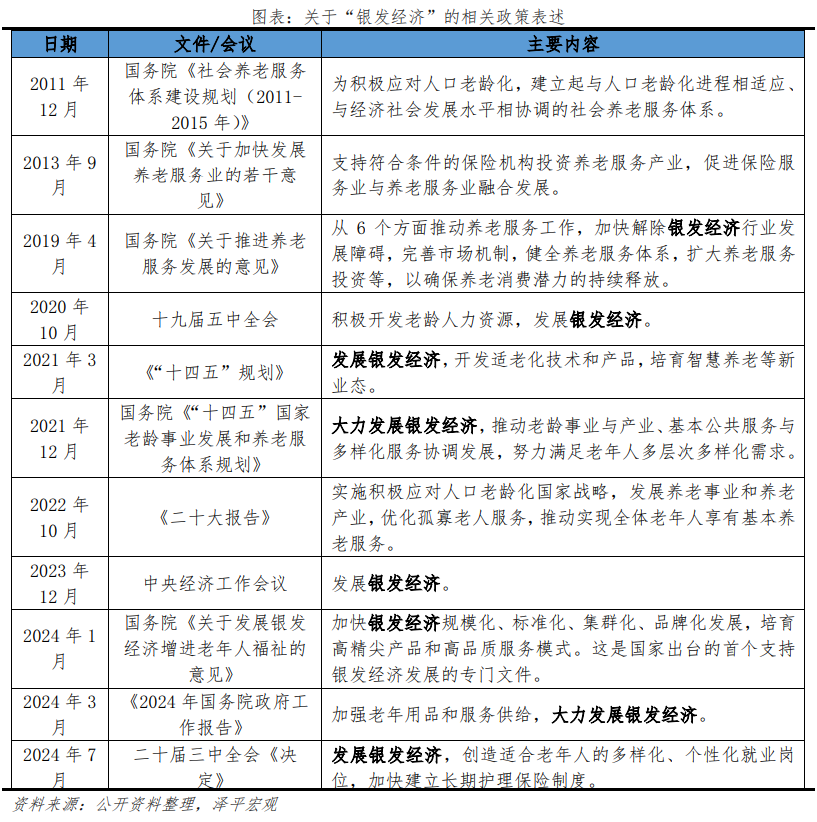 銀發(fā)經(jīng)濟(jì)是向老年人提供產(chǎn)品和服務(wù),以及為老齡階段做準(zhǔn)備等一系列經(jīng)濟(jì)活動的總和,既包括“為老”、也包括“備老”。“銀發(fā)經(jīng)濟(jì)”的概念起源于日本,后來歐美和其他亞洲國家陸續(xù)提出。我國在2019年提出“銀發(fā)經(jīng)濟(jì)”概念,2020年提出“發(fā)展銀發(fā)經(jīng)濟(jì)”,2024年1月國務(wù)院印發(fā)《關(guān)于發(fā)展銀發(fā)經(jīng)濟(jì)增進(jìn)老年人福祉的意見》,是首個以“銀發(fā)經(jīng)濟(jì)”命名的政策文件,對銀發(fā)經(jīng)濟(jì)做出明確定義:向老年人提供產(chǎn)品或服務(wù),以及為老齡階段做準(zhǔn)備等一系列經(jīng)濟(jì)活動的總和。