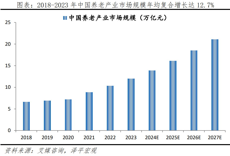 隨著人口老齡化時代到來,為滿足中老年人群體在衣、食、住、行、醫(yī)等方面需求,銀發(fā)經(jīng)濟(jì)市場潛力巨大,預(yù)計到2050年,老年人口消費(fèi)總量將占中國GDP的21%。新一代中老年人群教育水平普遍較高,他們在退休后更重視生活質(zhì)量和社交活動,愿意為自己興趣和愛好買單,這為銀發(fā)經(jīng)濟(jì)市場蓬勃發(fā)展提供堅實(shí)基礎(chǔ)。據(jù)艾媒咨詢、中國老齡科學(xué)研究中心數(shù)據(jù),2018-2023年,中國養(yǎng)老產(chǎn)業(yè)市場規(guī)模年均復(fù)合增長率達(dá)12.7%,預(yù)計2050年老年人口消費(fèi)總量為40萬-69萬億元,占全國GDP的20.7%。