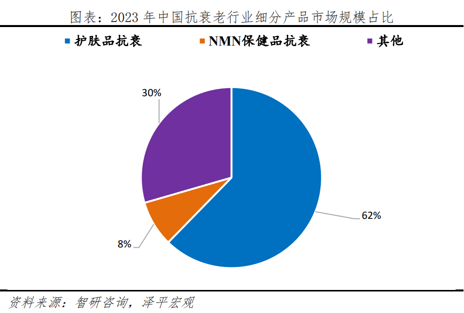 抗衰領(lǐng)域,隨著生活方式和化妝習(xí)慣變化,銀發(fā)族對永葆青春渴望推動抗衰老產(chǎn)品銷售增長,預(yù)計2024年中國抗衰市場規(guī)模達(dá)1500億元。2024年1月,國務(wù)院發(fā)布的《關(guān)于發(fā)展銀發(fā)經(jīng)濟(jì)增進(jìn)老年人福祉的意見》中強(qiáng)調(diào):“發(fā)展抗衰老產(chǎn)業(yè),推動生物技術(shù)與延緩老年病深度融合,開發(fā)老年病早期篩查產(chǎn)品和服務(wù)。”當(dāng)前,消費(fèi)者對抗衰老護(hù)膚品的需求日益多元化,市場消費(fèi)熱情持續(xù)高漲。根據(jù)智研咨詢數(shù)據(jù),2023年中國抗衰老行業(yè)市場規(guī)模約為1522億元,其中,護(hù)膚品抗衰老、NMN保健品抗衰、其他抗衰產(chǎn)品占比分別為62%、30%、8%。隨著抗衰老護(hù)膚品和保健品成分的迭代升級,越來越多消費(fèi)者認(rèn)可抗衰成分的有效性,并通過使用護(hù)膚品和保健品進(jìn)行抗衰老。根據(jù)艾媒咨詢數(shù)據(jù),目前,68.2%的消費(fèi)者通過健身進(jìn)行抗衰老,62.4%的消費(fèi)者使用護(hù)膚品,近五成的消費(fèi)者注重飲食和服用保健品。