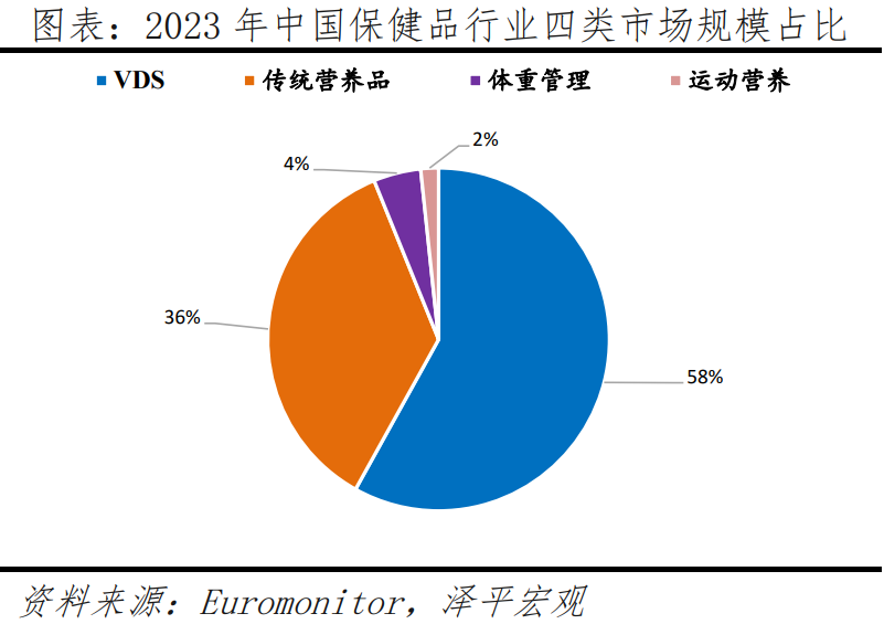 膳食補(bǔ)充劑占保健品市場主導(dǎo)地位,中老年人更偏好鈣片、奶粉、維生素和葉黃素等產(chǎn)品。保健品市場主要分為維生素和膳食補(bǔ)充劑(VDS)、運(yùn)動營養(yǎng)品、體重管理和傳統(tǒng)滋補(bǔ)四大類。根據(jù)Euromonitor數(shù)據(jù),2023 年VDS 市場規(guī)模占中國保健品行業(yè)近60%,消費(fèi)者主要出于日常增強(qiáng)免疫力的需求選擇VDS產(chǎn)品。其中,鈣片、奶粉、魚油、維生素、葉黃素等品類尤其受到中老年人的歡迎。例如,隨著年齡增長,老年人對營養(yǎng)的需求變化,專為老年人設(shè)計的高鈣奶粉、富含多種維生素和礦物質(zhì)的營養(yǎng)麥片、深海魚油等保健食品,有助于補(bǔ)充所需營養(yǎng),維持身體健康。對于患有慢性疾病或身體虛弱的老年人,膳食補(bǔ)充劑如維生素D、益生菌等,可以幫助他們更好地攝取營養(yǎng),增強(qiáng)免疫力。從市占率看,根據(jù)Euromonitor數(shù)據(jù),2023年湯臣倍健在VDS市場的市占率為10.4%,穩(wěn)居行業(yè)龍頭,其次是安利與健合集團(tuán),前十企業(yè)市場集中度低于40%,我國保健品市場仍具有較大的整合和發(fā)展空間。(膳食補(bǔ)充劑是含有維生素、礦物質(zhì)、草藥或其它植物產(chǎn)品或氨基酸的產(chǎn)品(除煙草之外)。)
