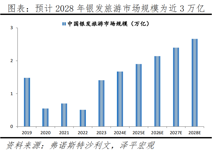 展望未來,隨著60、70后“黃金一代”逐漸步入老齡化,中高端旅游產(chǎn)品將迎來更多發(fā)展機(jī)遇,旅游服務(wù)重要性愈發(fā)凸顯,預(yù)計2028年,銀發(fā)旅游市場規(guī)模將達(dá)約2.7萬億元,2024-2028年年均復(fù)合增速將達(dá)12.4%。