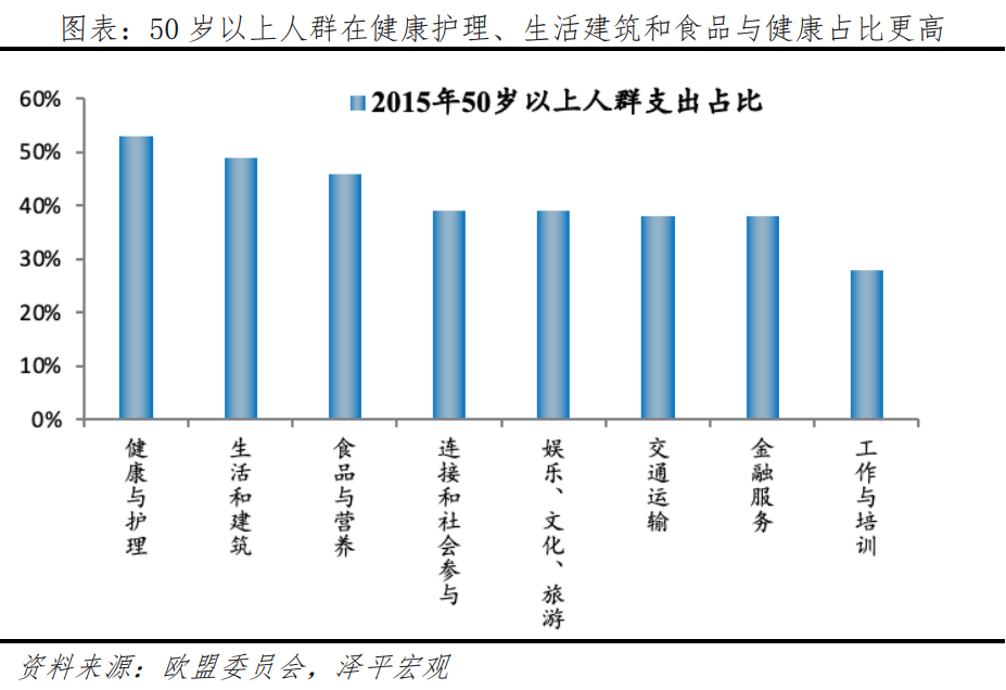 歐洲銀發(fā)經(jīng)濟(jì)發(fā)展主要集中于以下三個方面:1)基本功能性產(chǎn)品。為老年人營造友好環(huán)境,將無障礙設(shè)施以及老年人所需要的產(chǎn)品和服務(wù)納入主流市場。比如醫(yī)療健康、綜合護(hù)理服務(wù)等。2)生活方式相關(guān)產(chǎn)品。在工作、生活、住房、休閑、旅行、交通等方面,滿足不同老年群體需求。比如老年友好型大學(xué)、適老化住房、功能性食品、個性化營養(yǎng)方案、銀發(fā)旅游等。3)升級附加類產(chǎn)品。進(jìn)行科技化、智能化升級,進(jìn)而拉動新興市場。比如智能家居、健康管理、安全監(jiān)護(hù)、遠(yuǎn)程護(hù)理、服務(wù)機(jī)器人等。根據(jù)歐盟委員會《銀發(fā)經(jīng)濟(jì)》報告,2015年50歲以上人群支出占比前三名的行業(yè)是健康護(hù)理、生活建筑和食品與健康,分別為53%、49%、46%。