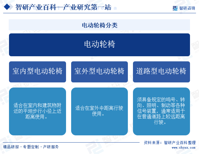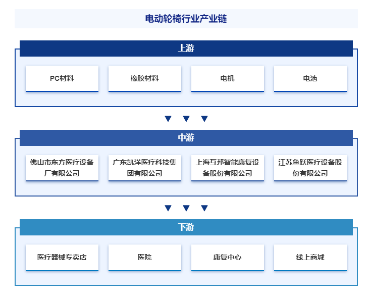 電動輪椅產(chǎn)業(yè)鏈上游為PC材料、橡膠材料、鋁合金、電機、電池、控制器、傳感器等。產(chǎn)業(yè)鏈中游為電動輪椅的生產(chǎn)制造商。產(chǎn)業(yè)鏈下游為醫(yī)療器械專賣店、醫(yī)院、康復中心、線上商城等。終端用戶包括老年人、殘疾人、傷病恢復者等需要輔助移動的群體。