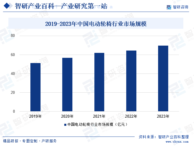 隨著全球人口老齡化的不斷加劇以及殘疾人口數(shù)量的穩(wěn)步增長,電動輪椅車的需求正呈現(xiàn)出顯著的增長趨勢。面對行動不便的困境,越來越多的老年人開始依賴電動輪椅作為他們?nèi)粘I钪械闹匾焦ぞ?,而殘疾人群體更是迫切需要電動輪椅來滿足他們的出行需求。2023年中國電動輪椅行業(yè)市場規(guī)模為69.72億元,同比增長8.13%。隨著國內(nèi)老齡化問題的日益凸顯,預計對電動輪椅車的需求將持續(xù)增加,從而推動整個行業(yè)市場規(guī)模的進一步上漲。