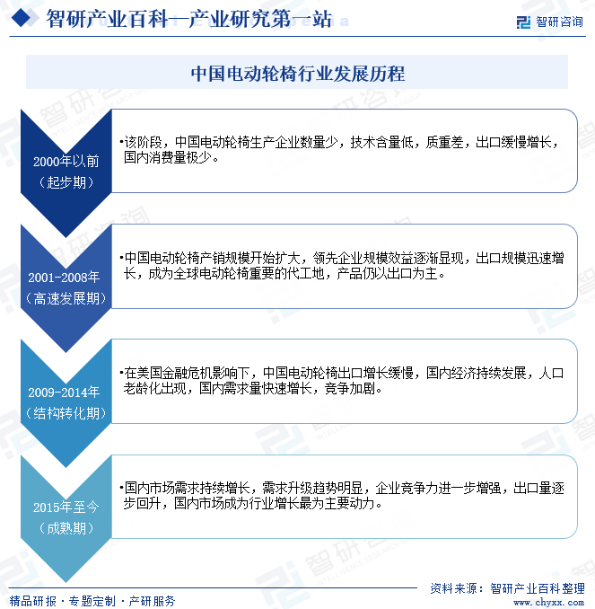 中國電動輪椅行業(yè)發(fā)展主要經(jīng)歷了四個階段。2000年以前的起步期,中國電動輪椅生產(chǎn)企業(yè)數(shù)量少,技術(shù)含量低,質(zhì)量差,出口緩慢增長,國內(nèi)消費量極少。2001-2008年的高速發(fā)展期,中國電動輪椅產(chǎn)銷規(guī)模開始擴大,領(lǐng)先企業(yè)規(guī)模效益逐漸顯現(xiàn),出口規(guī)模迅速增長,成為全球電動輪椅重要的代工地,產(chǎn)品仍以出口為主。2009年至2014年的結(jié)構(gòu)轉(zhuǎn)化期,在美國金融危機影響下,中國電動輪椅出口增長緩慢,國內(nèi)經(jīng)濟持續(xù)發(fā)展,人口老齡化出現(xiàn),國內(nèi)需求量快速增長,競爭加劇。2015年至今的成熟期,國內(nèi)市場需求持續(xù)增長,需求升級趨勢明顯,企業(yè)競爭力進一步增強,出口量逐步回升,國內(nèi)市場成為行業(yè)增長最為主要動力。