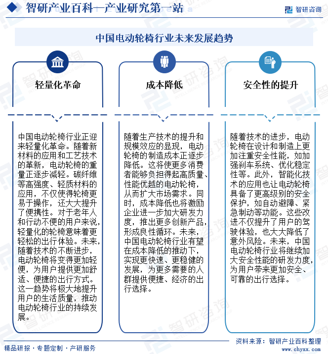 隨著中國人口老齡化的逐漸加劇,對電動輪椅等康復輔助器具的需求持續(xù)增長。國家通過相關(guān)政策推動康復醫(yī)療與康復輔助器具配置服務(wù)的銜接融合,為電動輪椅等產(chǎn)品的市場需求提供了有力保障。2024年1月,國務(wù)院印發(fā)《關(guān)于發(fā)展銀發(fā)經(jīng)濟增進老年人福祉的意見》,提出大力發(fā)展康復輔助器具產(chǎn)業(yè)。推動助聽器、矯形器、拐杖、假肢等傳統(tǒng)功能代償類康復輔助器具升級,發(fā)展智能輪椅、移位機、康復護理床等生活照護產(chǎn)品。在政策推動下,電動輪椅行業(yè)將加快技術(shù)創(chuàng)新和產(chǎn)品升級。隨著政策的推動和市場需求的增長,電動輪椅行業(yè)將逐漸實現(xiàn)標準化和規(guī)范化發(fā)展。這將有助于提升產(chǎn)品的質(zhì)量和安全性,降低生產(chǎn)成本和售價,進一步促進市場的擴大和普及。
