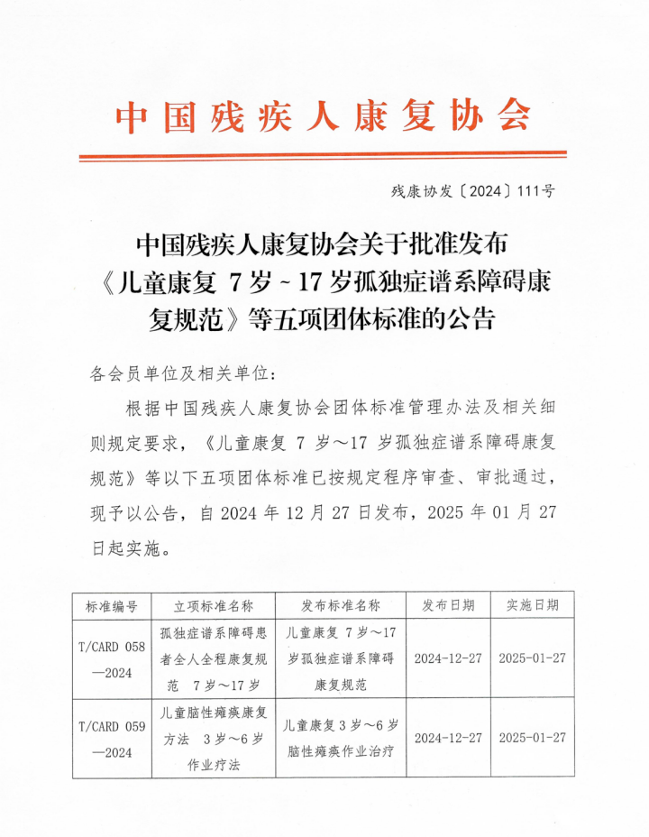 近日,中國殘疾人康復(fù)協(xié)會(huì)發(fā)布關(guān)于批準(zhǔn)發(fā)布《兒童康復(fù)7歲~17歲孤獨(dú)癥譜系障礙康復(fù)規(guī)范》等五項(xiàng)團(tuán)體標(biāo)準(zhǔn)的公告。公告稱《兒童康復(fù)7歲~17歲孤獨(dú)癥譜系障礙康復(fù)規(guī)范》等五項(xiàng)團(tuán)體標(biāo)準(zhǔn)已按規(guī)定程序?qū)彶?、審批通過,自2024年12月27日發(fā)布,2025年1月27日起實(shí)施。