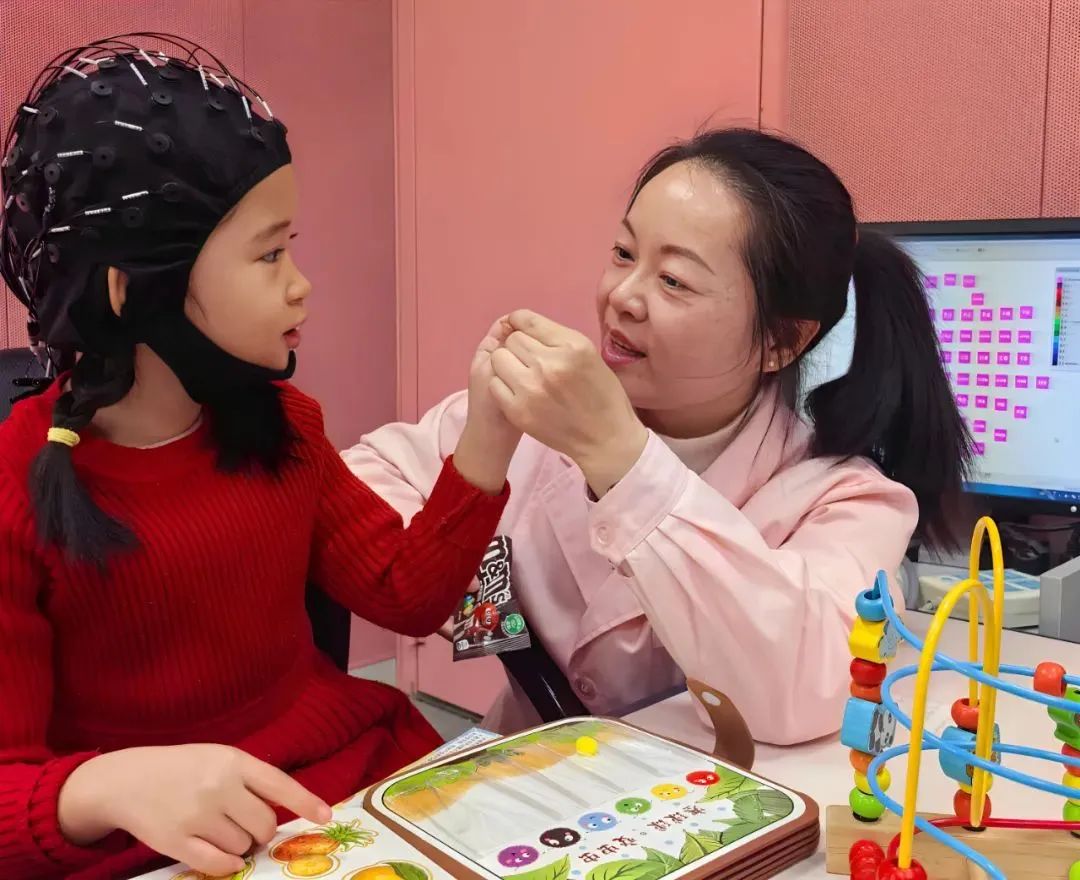 患有神經(jīng)性耳聾的3歲女孩然然(化名)則在MMR(失匹配反應(yīng))精準(zhǔn)言語聽覺訓(xùn)練服務(wù)的幫助下,通過腦機(jī)設(shè)備和客觀評估檢測,提高了言語和聽覺感知能力。
