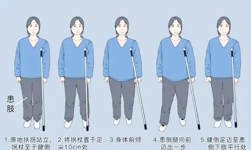 手杖使用技巧包括握持位置、步行與上下樓梯技巧。注意:在圖中,患側(cè)腿以藍色進行標記,而手杖則被放置在使用者的健側(cè)。手柄高度:當身體保持直立,雙手自然垂在身體兩側(cè)時,從手部橫紋處量起到地面的垂直距離。手杖的支點應擺放在健側(cè)腳邊約15厘米處,這是手杖使用的基礎姿勢。在平地行走時,建議初學者遵循三步走的順序:首先移動手杖,接著邁出患肢,最后走健肢。隨著對手杖使用的熟悉,可以逐漸過渡到兩步走:手杖與患肢同步前進,再邁出健肢。對于上下樓梯,則需分別注意:上樓時,手杖先行,緊接著健肢踏上樓梯,最后邁出患肢;下樓時,同樣遵循手杖先行的原則,但順序相反,即患肢先下,再邁健肢。