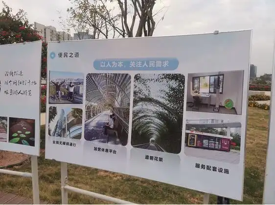 記者在現(xiàn)場觀察到,健康步道的路面還做了防滑設(shè)計(jì),非常適合殘疾人、老年人等行動(dòng)不便的群體行走;步道中段還設(shè)有加寬休息平臺(tái)、遮蔭花架等供人休息,休息平臺(tái)上方的遮雨棚還印有藍(lán)天白云、白鴿、彩虹等以“廈門藍(lán)”為主題的彩繪圖案。