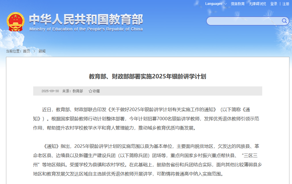 近日,教育部、財政部聯(lián)合印發(fā)《關(guān)于做好2025年銀齡講學(xué)計劃有關(guān)實施工作的通知》。根據(jù)國家銀齡教師行動計劃整體部署,今年計劃招募7000名銀齡講學(xué)教師,發(fā)揮優(yōu)秀退休教師引領(lǐng)示范作用,幫助提升農(nóng)村學(xué)校教學(xué)水平和育人管理能力,推動城鄉(xiāng)教育優(yōu)質(zhì)均衡發(fā)展?!锻ㄖ访鞔_,申請銀齡講學(xué)計劃的退休教師以校長、教研員、特級教師、骨干教師為主,年齡一般在65歲(含)以下等等。