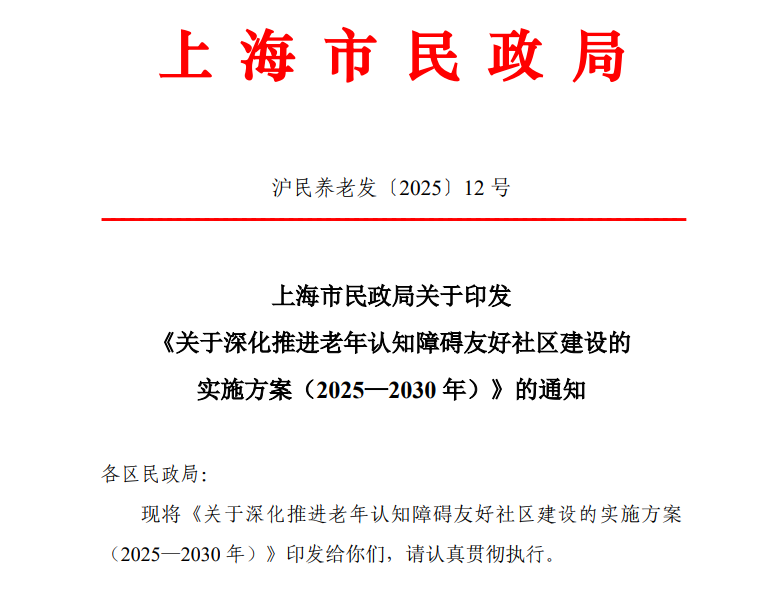 上海市民政局印發(fā)《關(guān)于深化推進(jìn)老年認(rèn)知障礙友好社區(qū)建設(shè)的實施方案(2025—2030年)》的通知,內(nèi)容包括加快健全三級老年認(rèn)知障礙支持網(wǎng)絡(luò)、完善全鏈條老年認(rèn)知障礙服務(wù)體系、加強(qiáng)老年認(rèn)知障礙友好氛圍營造等方面。到2030年實現(xiàn)上海市全市老年認(rèn)知障礙社區(qū)干預(yù)機(jī)制全面有效建立,認(rèn)知障礙老年人及其家庭在社區(qū)普遍能便捷獲得支持關(guān)愛,老年認(rèn)知障礙友好城市基本建成。60周歲以上老年人及其家庭對認(rèn)知障礙友好社區(qū)項目以及認(rèn)知障礙科普知識的知曉率達(dá)到80%等。