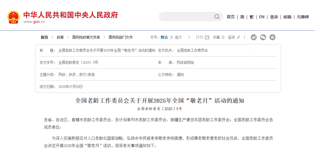 近日,全國老齡工作委員會印發(fā)通知,啟動2025年全國“敬老月”活動,主題為“弘揚孝親敬老美德,共建老年友好社會”,活動時間為2025年10月10日至31日,活動內(nèi)容包括開展人口老齡化國情教育活動、開展走訪慰問和關(guān)愛幫扶老年人活動、開展老年用品和服務(wù)項目宣傳推廣活動、開展老年人健康促進(jìn)活動、開展老年人精神文化生活提升活動以及開展老年人權(quán)益保障法治護(hù)航活動等。