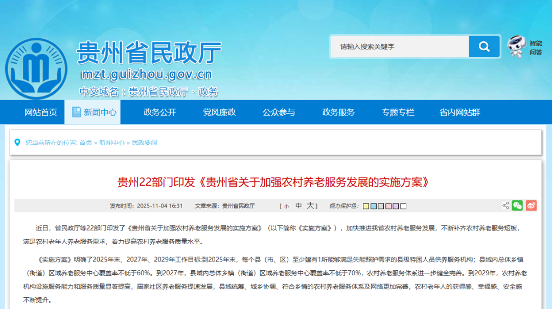 貴州22部門印發(fā)《貴州省關(guān)于加強農(nóng)村養(yǎng)老服務(wù)發(fā)展的實施方案》
