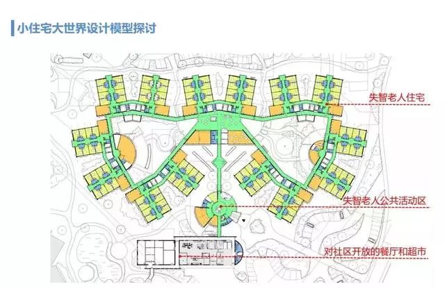 針對不同類型的老人,需要有不同的設(shè)計策略,不能把不同類型的失智老人混在一起,禪修型的需要一個安靜的角落,而浪人型則需要足夠的活動空間。荷蘭對失智癥老人的心理特征、需求的研究已經(jīng)形成了一套非常有特色的失智癥照護(hù)模式和設(shè)計模型,我們把這個模型叫做“小住宅,大世界”,老人們以6~8人為一個單元,共用一個大起居室。不同健康狀況的老人,活動范圍分為三個級別:病情重的只能在自己的單元里活動,狀況稍好的可以到別的單元里串門,級別最高的可以到達(dá)對外的公共餐廳和超市等區(qū)域,但不能走出養(yǎng)老院。