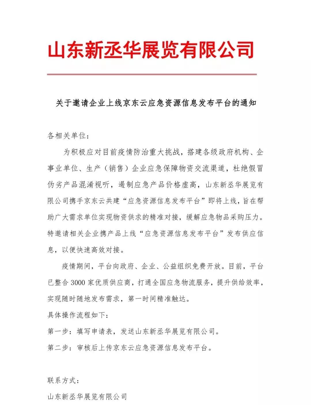 近日,疫情肆虐,多地應(yīng)急物資紛紛告急。為幫助各級政府 部門、醫(yī)療機(jī)構(gòu)實現(xiàn)物資供求信息的精準(zhǔn)對接,緩解疫情壓力,由京東團(tuán)隊研發(fā)“應(yīng)急資源信息發(fā)布平臺”及“智能情感客服”,山東新丞華展覽有限公司負(fù)責(zé)面向全國醫(yī)療衛(wèi)生機(jī)構(gòu)推廣,強(qiáng)強(qiáng)聯(lián)合,攜手打贏疫情阻擊戰(zhàn)。