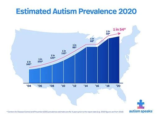 美國疾病預(yù)防控制中心(CDC)日前發(fā)布的數(shù)據(jù)顯示:在美國,每54個(gè)兒童中就有1名患有自閉癥(1:54),自閉癥患病率比2016年提高了近10%。