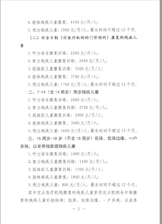 15周歲-18歲(不含18周歲)低保、低保邊緣、一戶多殘、以老養(yǎng)殘家庭聽力語言殘疾兒童康復訓練每人每年可享最高1.2萬元的康復補助;智力殘疾兒童康復訓練每人每年可享最高1.68萬元的康復補助;孤獨癥兒童康復訓練每人每年可享最高1.8萬元的康復補助;肢體殘疾兒童康復訓練每人每年可享最高2.16萬元的康復補助;視力殘疾兒童康復訓練每人可享最高0.96萬元的康復補助。