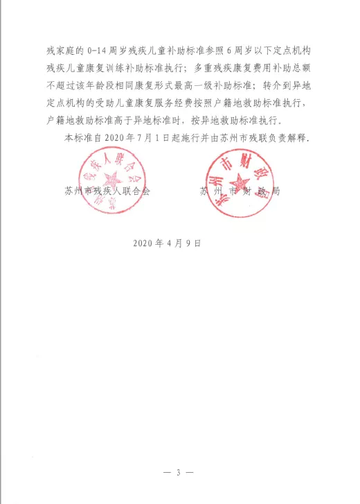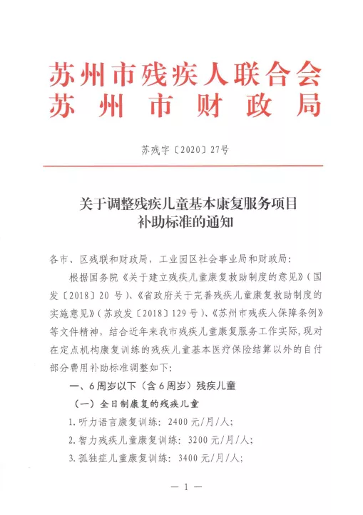日前,蘇州市殘疾人聯(lián)合會、蘇州市財政局聯(lián)合下發(fā)《關于調(diào)整殘疾兒童基本康復服務項目補助標準的通知》。根據(jù)該通知,從2020年7月1日起,蘇州市對在定點機構康復訓練的殘疾兒童基本醫(yī)療保險結算以外的自付部分費用補助標準進行調(diào)整,殘疾兒童基本康復項目補助標準再提高,補助年齡也進一步擴大至18歲。