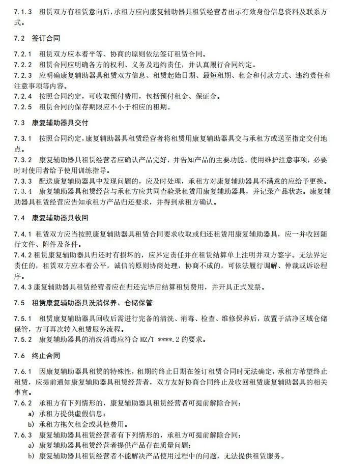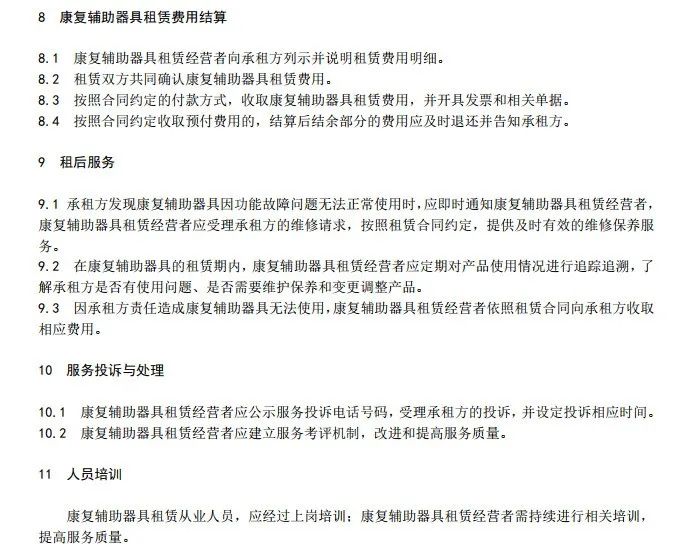 該意見稿從租賃場(chǎng)所、租賃用康復(fù)輔具、服務(wù)流程、租賃費(fèi)用結(jié)算、租后服務(wù)、投訴與處理、人員培訓(xùn)等7個(gè)方面規(guī)定了康復(fù)輔具租賃服務(wù)的基本要求。